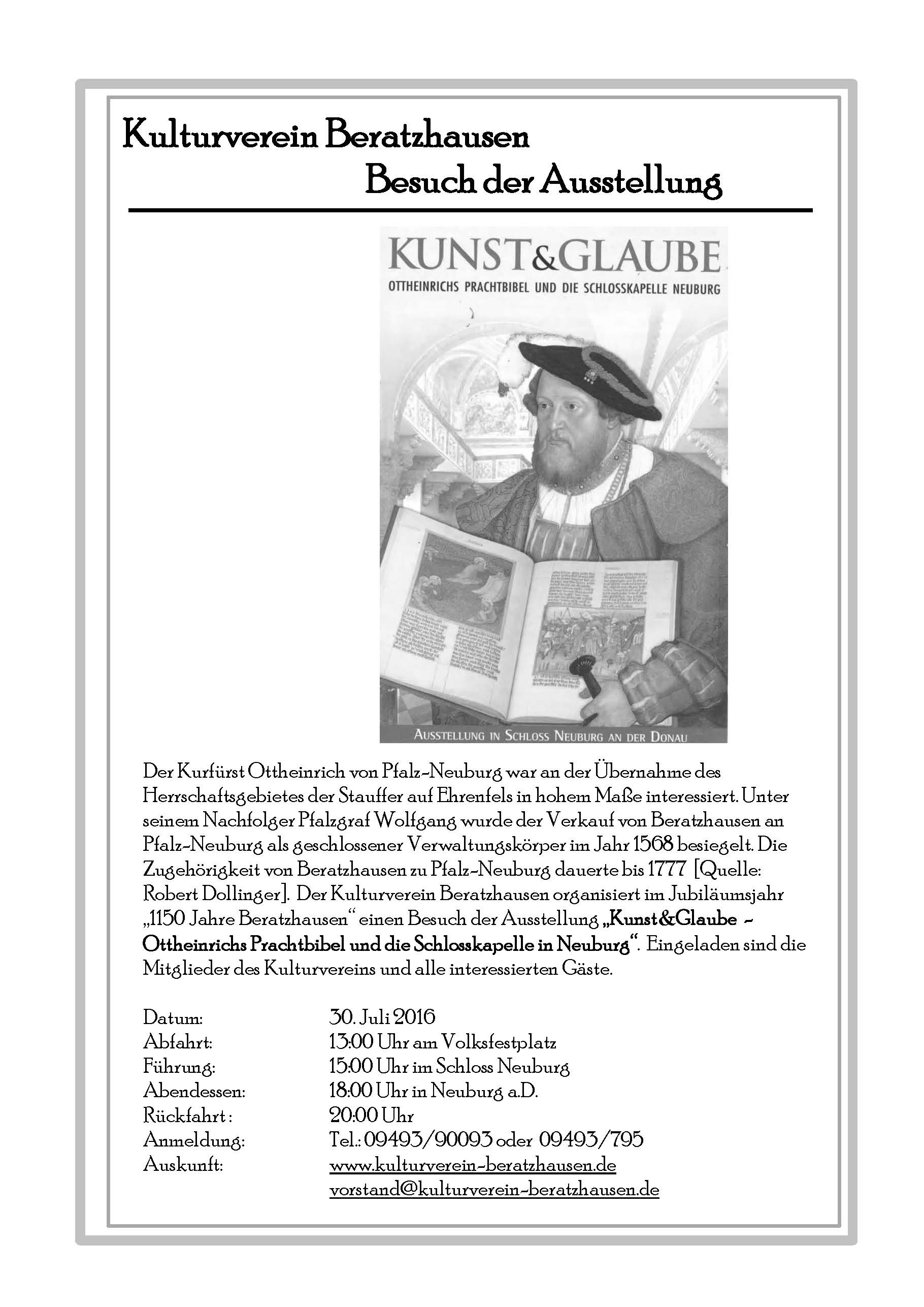 Die Führung durch die Ausstellung für den Kulturverein wird 75 Minuten dauern. Das Abendessen wird um 18:00 Uhr in der "Blauen Traube eingenommen."