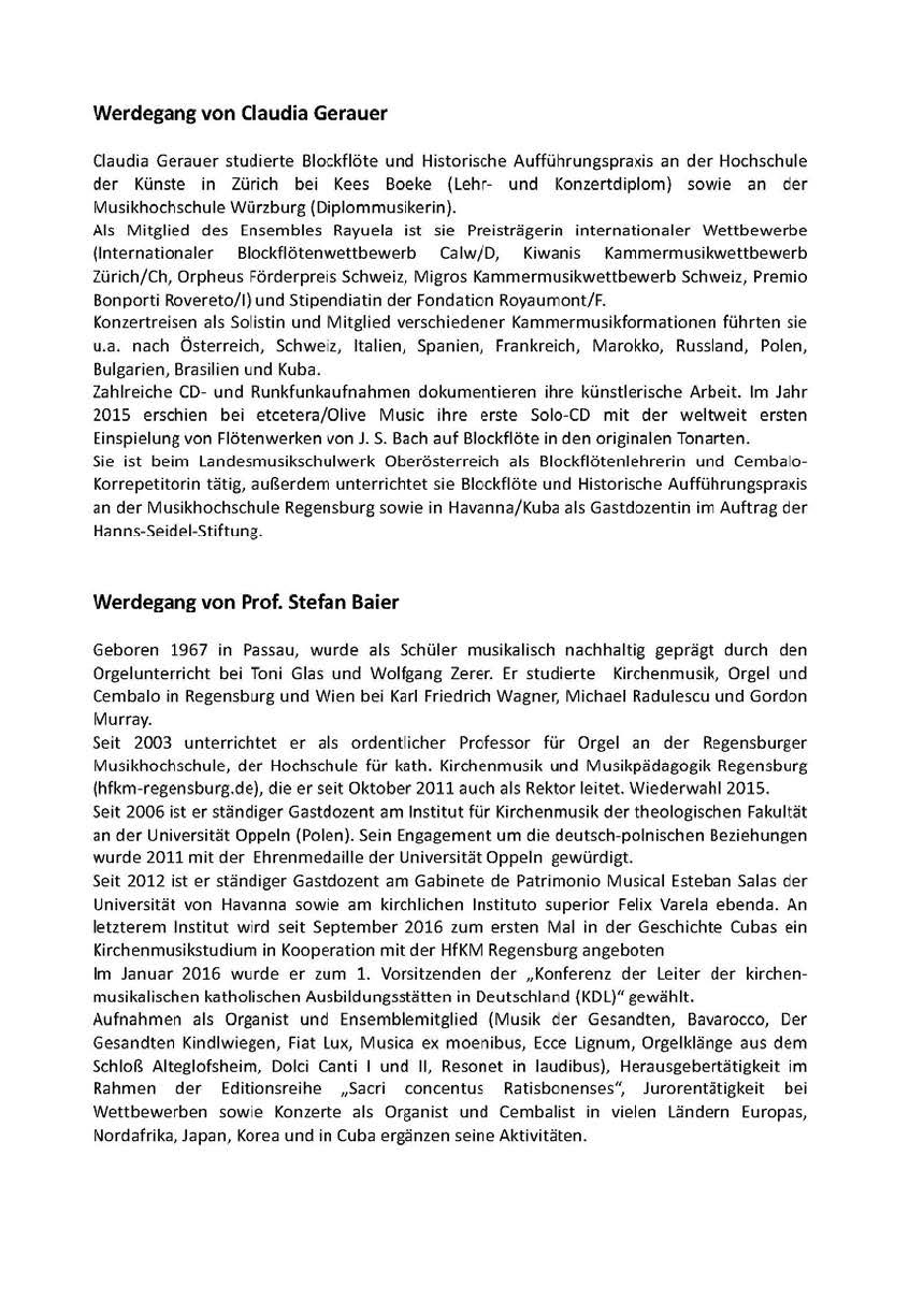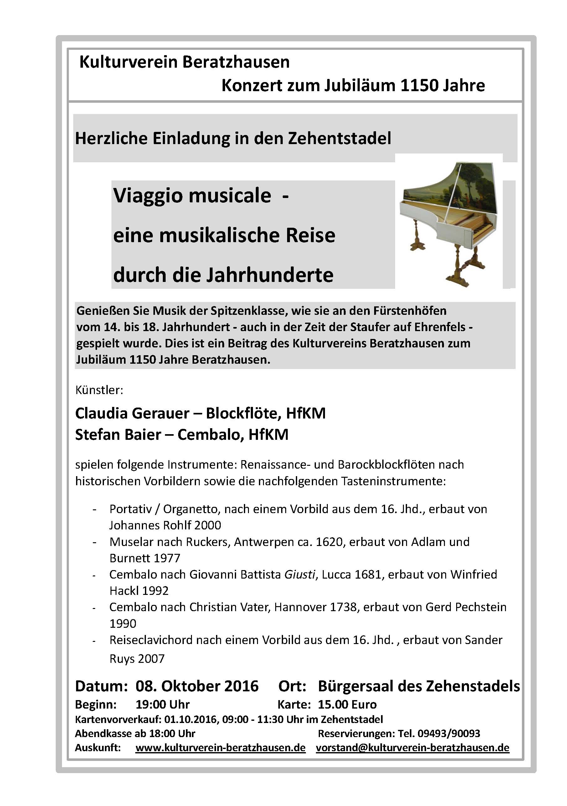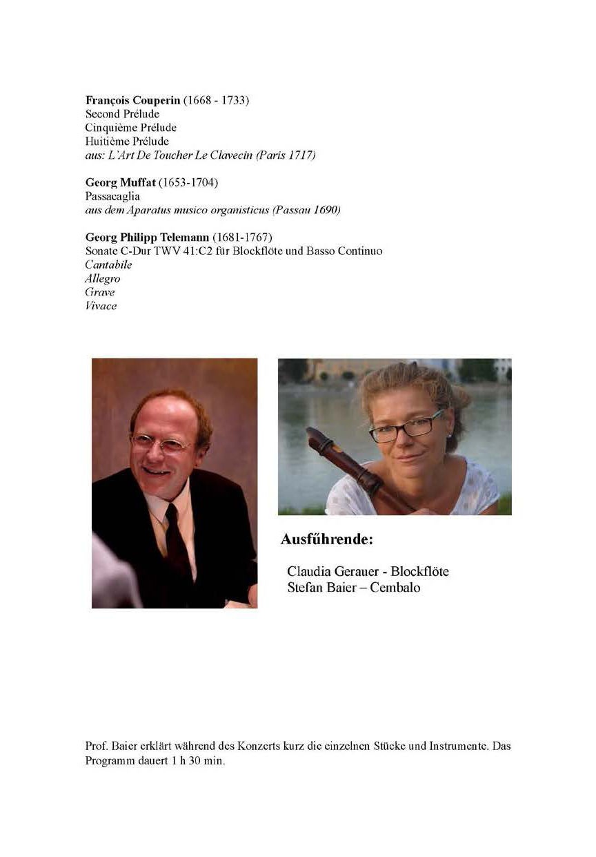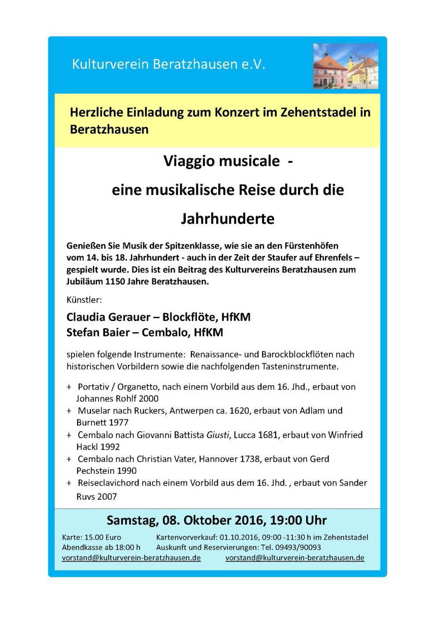 Dem Vorstand des Vereins ist es gelungen, ein Konzert der Spitzenklasse nach Beratzhausen zu bringen. Stefan Baier, Prof. für Orgel und Cembalo an der Hochschule für Katholische Kirchenmusik und Musikpädagogik hat gemeinsam mit der Dozentin Claudia Gerauer eine musikalische Reise durch die Jahrhunderte angeboten. Beide Interpreten genießen internationales Ansehen. Es waren Kompositionen vom 14. bis zum 18. Jahrhundert zu hörenn. Es könnte durchaus sein, dass einige Werke vor rund 500 Jahren – in der Zeit der Staufer auf Ehrenfels – zum letzten Mal in Beratzhausen erklungen sind. Prof. Stefan Baier hat das ganz spezielle Programm eigens für Beratzhausen zusammengestellt. Zusammen mit Claudia Gerauer hat er die Werke erläutert und mehrere Instrumente in alter Bauart vorgestellt.